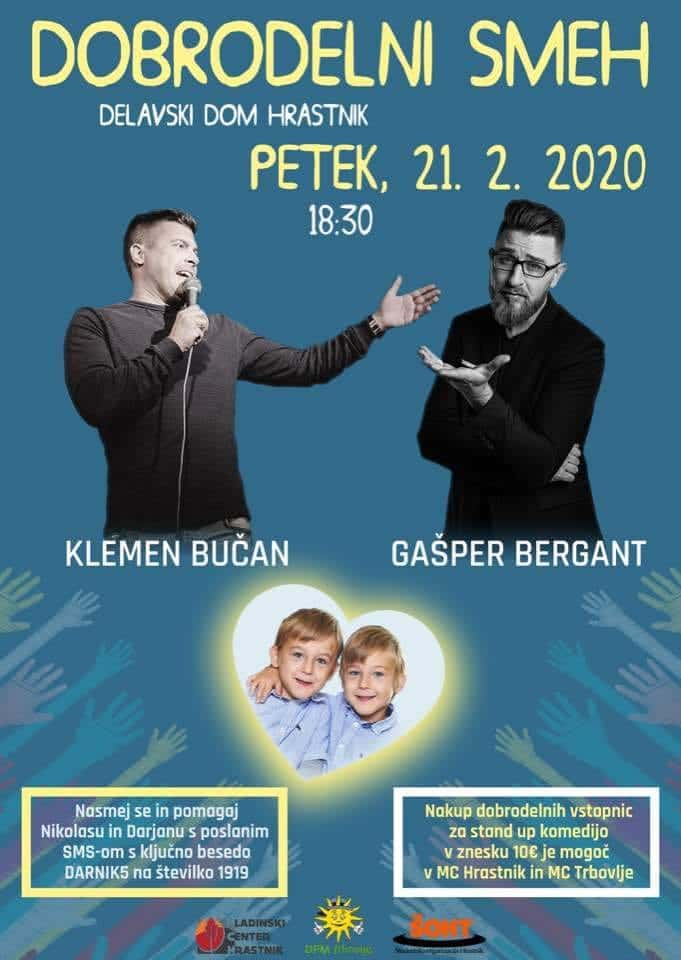 Prav zato so domače organizacije, ki prepoznavajo stisko družine, pripravile dobrodelni dogodek, na katerem se boste lahko v Delavskem domu Hrastnik obiskovalci nasmejali, obenem pa z nakupom vstopnice za stand up komedijo v izvedbi Klemna Bučana in Gašperja Berganta storili veliko delo – pomagali dvojčkoma Darjanu in Nikolasu.