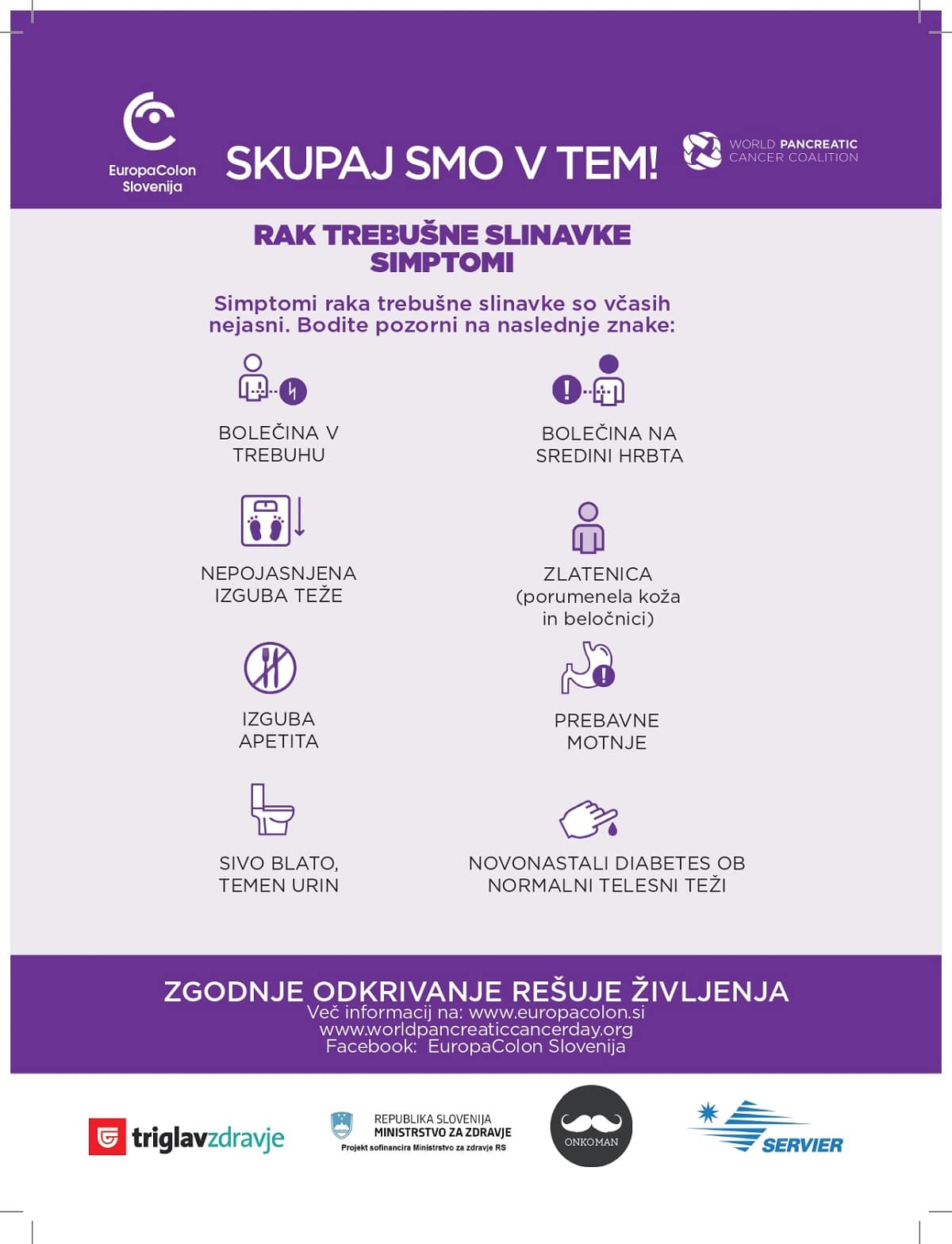 Kot pravijo v Združenju EuropaColon Slovenija, ki je eden od pobudnikov te akcije pri nas, so znaki raka trebušne slinavke naslednji: splošno slabo počutje, bolečina v žlički in/ali v sredini hrbta, izrazita nepojasnjena izguba telesne teže, svetlo blato, zelo temen urin. Prav informiranje o simptomih in pomenu čim zgodnejšega odkrivanja tega raka je tudi eno ključnih sporočil Združenja, ki prav v teh dneh zaključuje dveletno ozaveščevalno kampanjo Skupaj smo v tem!