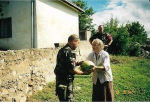 Med patruljiranjem je srečal deklico, ki je v vojni izgubila oba starša. Zgovorni Simon je začel pogovor …Tisti Simon, ki je ves čas nosil kar je lahko nabral, nato pa razdelil med domačine, se je spomnil na žvečilni v žepu. “Iskal sem, kaj bi lahko lepega naredil zanjo. Nismo imeli ničesar, zato sem pogosto po bazi poiskal, kar je le mogoče in podelil med otroke. Spomnil sem se, da imam v žepu žvečilni gumi. Ko sem ga ponudil deklici, se ji niti ni sanjalo, kaj je to. Ko bi videli, kakšno presenečenje je bilo to zanjo,” se v živo spominja naš sogovornik, katerega dobro delo je, sicer na varni razdalji še vedno prestrašena ob prihodu vojakov, opazila tudi njena babica. Tako navdušena nad dejanjem mladega vojaka, je odšla za hišo in poiskala ogromno lubenico. Drugega namreč niso imeli in le to odnesla v dar vojaku. Vojaki so bili nad radodarnostjo babice, ki je že tako ostala brez vsega, tako navdušeni, da so dogodek tudi fotografirali, Simon pa je ob našem obisku iz svojega bogatega arhiva to fotografijo tudi poiskal.