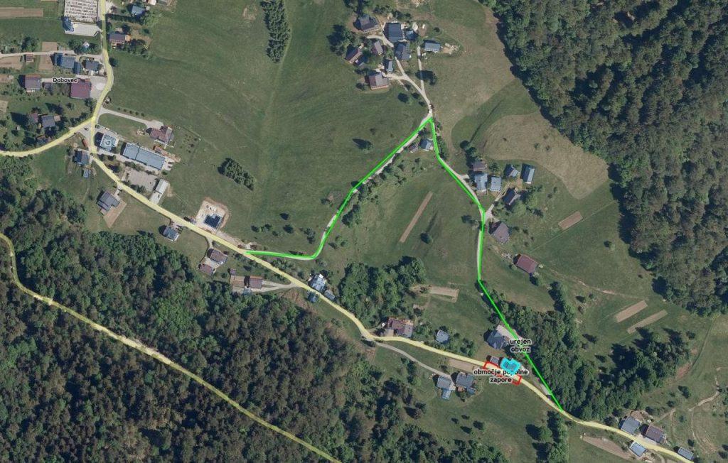 Popolno zaporo ceste so vzpostavili zaradi gradnje opornega zidu ob objektu Dobovec 33. Obvoz je urejen po javnih poteh JP 924741 (Na jami) in JP 924731 (Dolanc – Na jami).