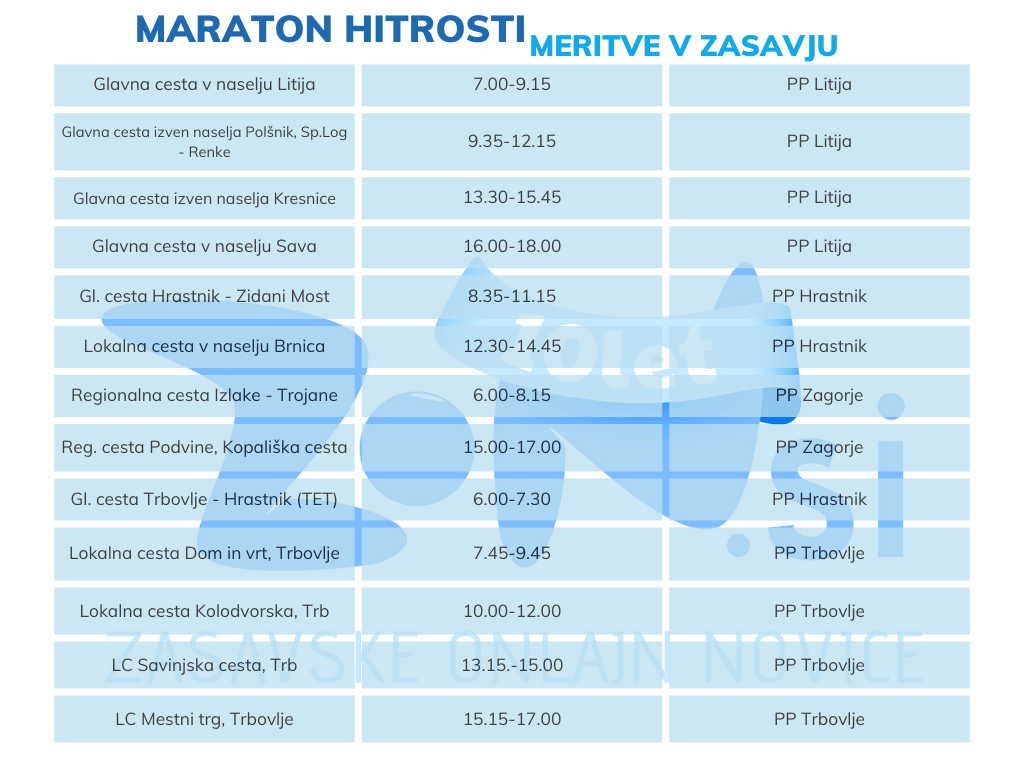 Maraton nadzora hitrosti bo na teh lokacijah potekal jutri, 19. aprila med 6. in 18. uro. Z vnaprejšnjim obveščanjem voznikov in objavo lokacij želijo delovati predvsem preventivno, da bi vozniki z umirjeno in defenzivno vožnjo pripomogli k varnejšim cestam, s takšno vožnjo pa nadaljevali tudi takrat, kadar ne potekajo tovrstni poostreni nadzori.