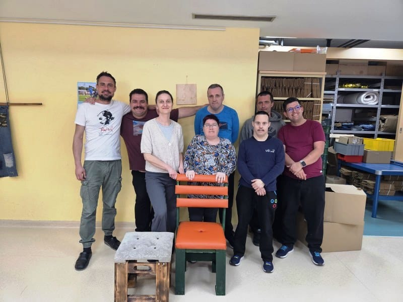 Ob našem obisku so z veseljem in ponosno pokazali dva stola, ki so ju ravno izdelali. Eden z naslonjalom, drugi brez. Oba so najprej iz starih palet sestavili, nato pa so ju še oblazinili in tapecirali.