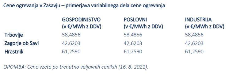 V Trbovljah za energent ogrevanja uporabljajo zemeljski plin, kot tudi v Hrastniku. Nižjo ceno ogrevanja imajo Zagorjani na račun lesne biomase. »V preteklih letih se je uporaba plina, skupaj s kogeneracijo, izkazala za smotrno, saj je cena ogrevanja ostajala ugodna, tako v primerjavi s sosednjimi občinami, kot tudi v slovenskem merilu,« so prepričani na trboveljski komunali. Spodnja razpredelnica kaže primerjavo cen ogrevanja po trenutno veljavnih cenikih v Zasavju.