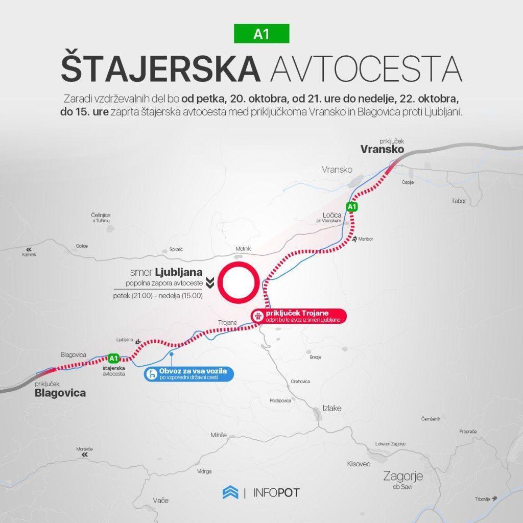 Zaradi vzdrževalnih del bo od petka, 20. oktobra, od 21. ure do nedelje, 22. oktobra, do 15. ure zaprta štajerska avtocesta med priključkoma Vransko in Blagovica proti Ljubljani. V času del bo na priključku Trojane odprt le izvoz iz smeri Ljubljane proti Mariboru.