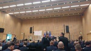 Kot je povedal predsednik GZ Trbovlje Tone Fakin, so zaradi obveznosti številnih v popoldanskem, za razvitje predvidenem času, to dolžnost opravili že tekom dopoldneva in sicer na sedežu trboveljske gasilske zveze, kjer imajo prostore tudi gasilci PGD Trbovlje – mesto, navzoča pa sta bila oba, tako Fakin sam kot tudi poveljnik GZ Trbovlje Grega Klenovšek ter okrog deset gasilcev.