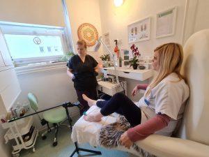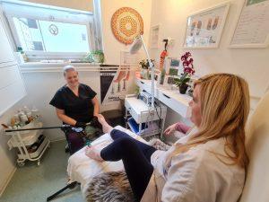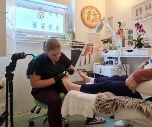 Kar 70 do 80 odstotkov odraslih ima glivic, pove Tomšičeva, ki se je prav zaradi tega odločila za dopolnitev storitve z napravo PACT MED – fotodinamiko, ki odpravlja okužbo nohtov na rokah in nogah. Pa še toliko bolj priročno je, ker je prenosna in jo lahko odnese tudi, kadar pedikuro dela stranki na domu. »Takšnih je vse več. Starejših, ki težko ali pa sploh ne morejo od doma, zaradi bolezni ali starosti« pove Tomšičeva, ki se še predobro zaveda težav mobilnosti, zato stranke v Hrastniku in Trbovljah po potrebi obišče tudi na domu. Prilagodi se, kolikor je mogoče.