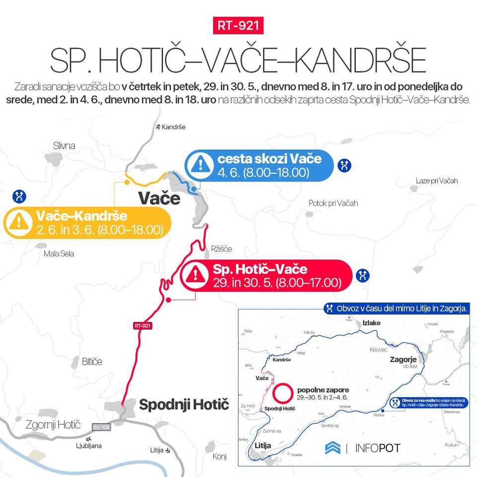 Že jutri in v petek bo zaradi rekonstrukcije cestišča na Vačah med 8. in 17. uro zaprt odsek Spodnji Hotič – Vače. Uraden obvoz bo v času del voden po cestah na relaciji Spodnji Hotič – Litija – Zagorje – Izlake – Kandrše.