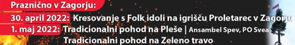 Občina Zagorje ob Savi v sodelovanju z Zavodom za šport Zagorje vabi na kresovanje, ki bo v soboto, 30. aprila, na igrišču Proletarec v Zagorju, z začetkom ob 20. uri. Za dobro zabavo bodo poskrbeli Folk idoli.