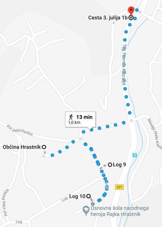 Po obisku Občine in Upravne enote se je Hinko iz Hrastnika odpravil na Center za socialno delo ter na zavarovalnico, ki sta oddaljeni le nekaj korakov, daljšo pot je imel potem še do Zavoda za zaposlovanje na Cesti 3. julija, do tam je rabil 13 minut.