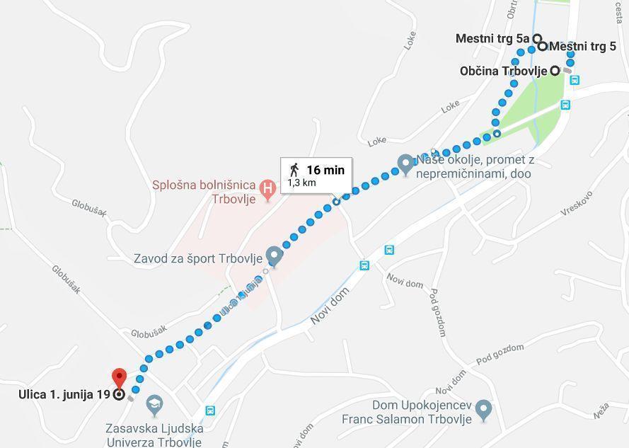 V Trbovljah se je Tone odpravil na Občino in Upravno enoto, ki sta tako kot v vseh treh občinah v isti stavbi, potem pa jo je mahnil kar čez parkirišče proti Centru za socialno delo ter zdravstveni zavarovalnici, ki sta skoraj skupaj. Največ časa mu je vzela pot po enosmerni ulici do Zavoda za zaposlovanje na Ulici 1. junija, porabil je 16 minut.